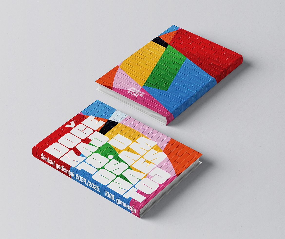 Za potrebe 18. gimnazije osmislili smo dizajn omota godišnjaka koji vizualno interpretira stanje zgrade u obnovi kroz motiv šarenih cigli u pozadini. U kontrastu s dinamičnim, grafički snažnim elementima pozadine, upečatljiva tipografija na naslovnici osigurava jasan identitet godišnjaka te pojačava njegov komunikacijski utjecaj. Ovaj spoj kolorita, strukture i tipografije stvara vizual koji je istovremeno moderan, prepoznatljiv i u skladu s pričom same škole.